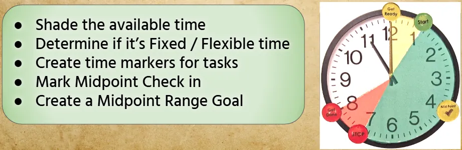 - SHADE the total time available for a task on a visual clock.
